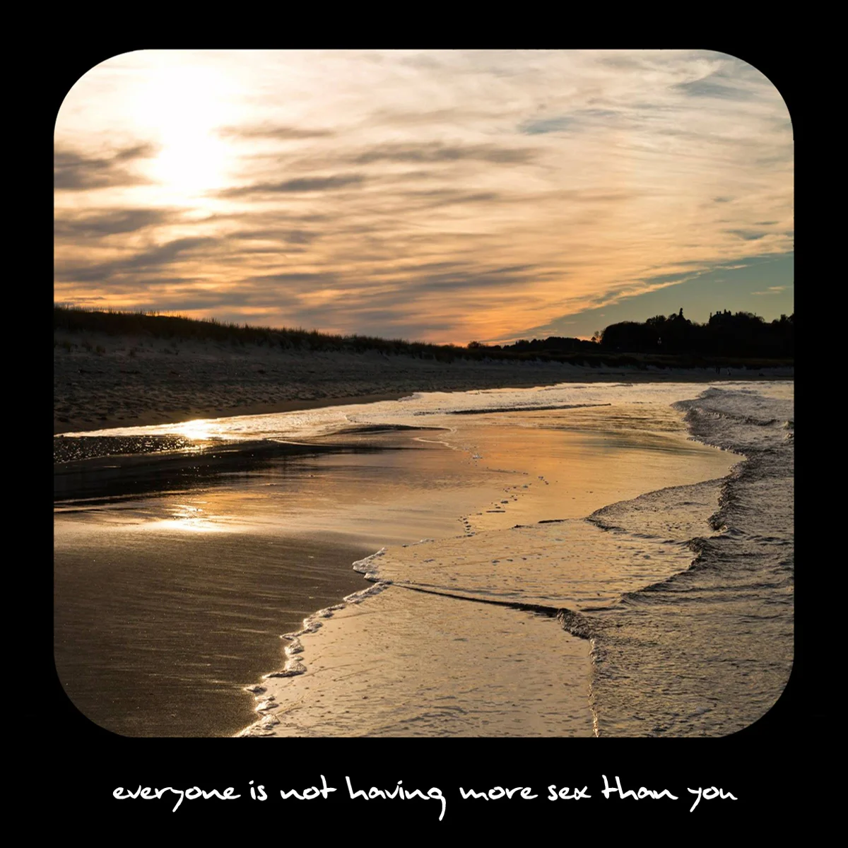 This piece is not a call to action like Stop but rather a reassuring voice of reason. The glistening image of the beach at sunset calls to mind idealized notions of romance and sex. The text, however, undercuts this association and subverts the incessant mainstream, commercial media’s message that everyone, absolutely everyone, is having a lot of exciting sex all the time, and if you’re not, you aren’t living right, are missing out, and are decidedly a loser.