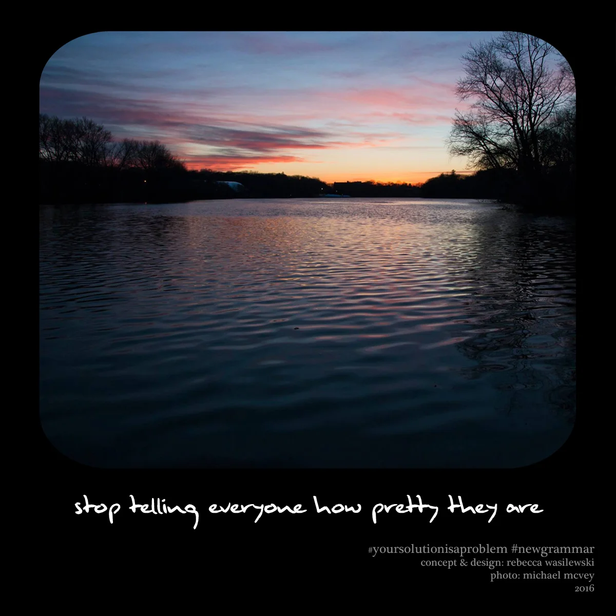 Stop Telling Everyone How Pretty They Are and Everyone Is Not Having More Sex Than You are the first two pieces in a new series that references and undermines certain visual and thematic trends of today. They are allusions to —but not mimics of— a pervasive social media format of a “pretty” photo paired with an “inspirational” quote. Unlike these memes that saturate Facebook, Twitter, and Instagram, however, Stop and Everyone contain unexpected messages in their text.